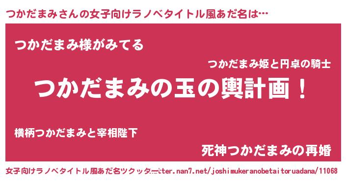 つかだまみさんの女子向けラノベタイトル風あだ名は… 『つかだまみの玉の輿計画!』『つかだまみ様がみてる』『死神つかだまみの再婚』 ツクッター #女子向けラノベタイトル風あだ名ツクッター http://tkutter.nan7.net/joshimukeranobetaitoruadana/11068/
