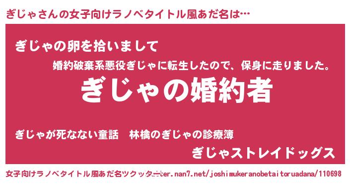 | 男性向けラノベタイトル風あだ名 | 『うちの娘の為ならば、俺はもしかしたらぎじゃも倒せるかもしれない。』 |