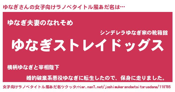 | 男性向けラノベタイトル風あだ名 | 『Re:ゆなぎから始める異世界生活』 |
