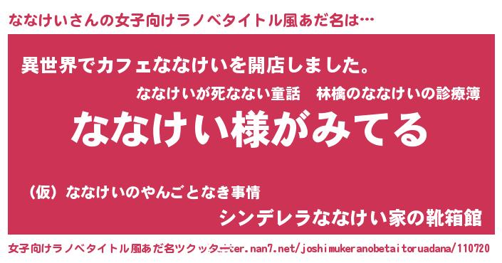 | 男性向けラノベタイトル風あだ名 | 『ななけいの嫁は女の子じゃないと思った?』 |