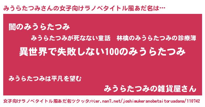 みうらたつみさんの女子向けラノベタイトル風あだ名は… 『異世界で失敗しない100のみうらたつみ』『闇のみうらたつみ』『みうらたつみの雑貨屋さん』 ツクッター #女子向けラノベタイトル風あだ名ツクッター http://tkutter.nan7.net/joshimukeranobetaitoruadana/110742/