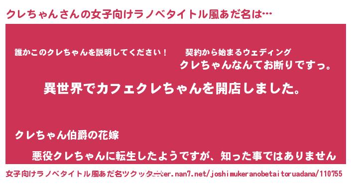 | 男性向けラノベタイトル風あだ名 | 『誰もが恐れるあのクレちゃんが、ぼくの専属メイドになるようです。』 |