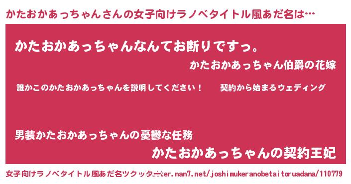 かたおかあっちゃんさんの女子向けラノベタイトル風あだ名は… 『誰かこのかたおかあっちゃんを説明してください! ~契約から始まるウェディング~』『かたおかあっちゃんなんてお断りですっ。』『かたおかあっちゃんの契約王妃』 ツクッター #女子向けラノベタイトル風あだ名ツクッター http://tkutter.nan7.net/joshimukeranobetaitoruadana/110779/