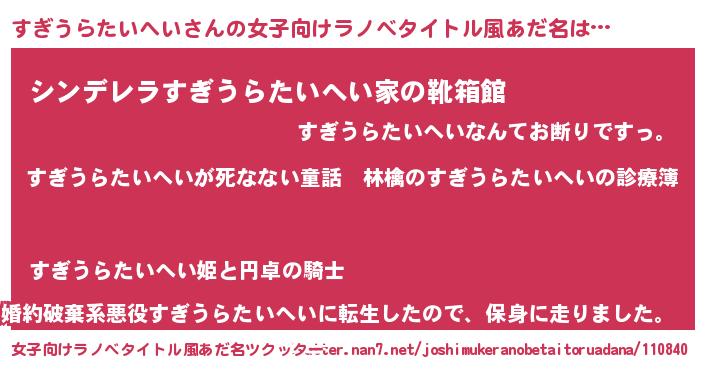 | 男性向けラノベタイトル風あだ名 | 『魔弾の王とすぎうらたいへい』 |