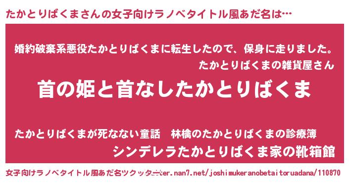 | 男性向けラノベタイトル風あだ名 | 『はたらくたかとりばくまさま!』 |