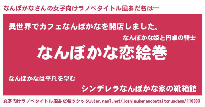 | 男性向けラノベタイトル風あだ名 | 『おまえをオタクにしてやるから、俺をなんぼかなにしてくれ! 』 |