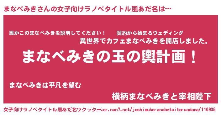 | 男性向けラノベタイトル風あだ名 | 『まなべみき~年齢イコール彼女いない歴の魔法使い~』 |
