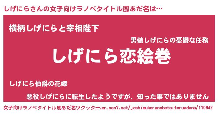 | 男性向けラノベタイトル風あだ名 | 『おまえをオタクにしてやるから、俺をしげにらにしてくれ! 』 |