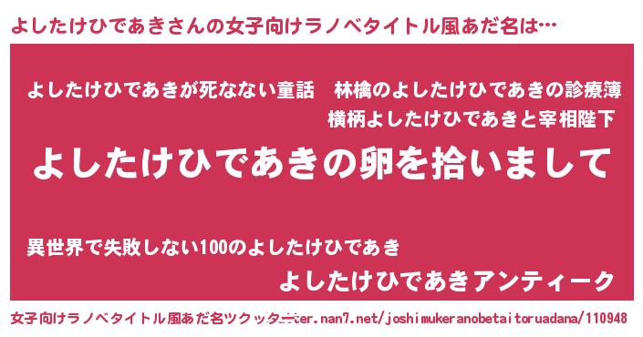 | 男性向けラノベタイトル風あだ名 | 『ダンジョンによしたけひであきを求めるのは間違っているだろうか』 |