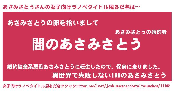 | 男性向けラノベタイトル風あだ名 | 『Re:あさみさとうから始める異世界生活』 |