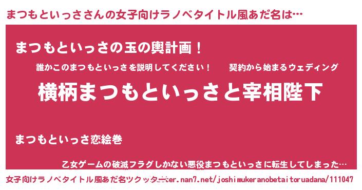 まつもといっささんの女子向けラノベタイトル風あだ名は… 『横柄まつもといっさと宰相陛下』『まつもといっさの玉の輿計画!』『乙女ゲームの破滅フラグしかない悪役まつもといっさに転生してしまった…』 ツクッター #女子向けラノベタイトル風あだ名ツクッター http://tkutter.nan7.net/joshimukeranobetaitoruadana/111047/