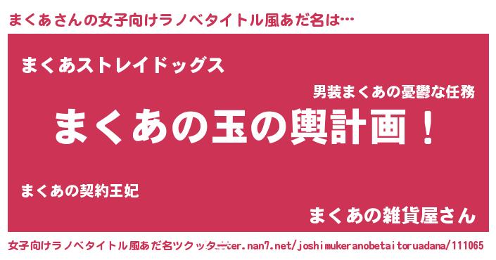 | 男性向けラノベタイトル風あだ名 | 『まくあ~年齢イコール彼女いない歴の魔法使い~』 |