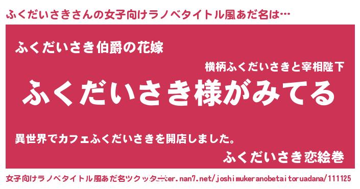 | 男性向けラノベタイトル風あだ名 | 『ふくだいさきの嫁は女の子じゃないと思った?』 |
