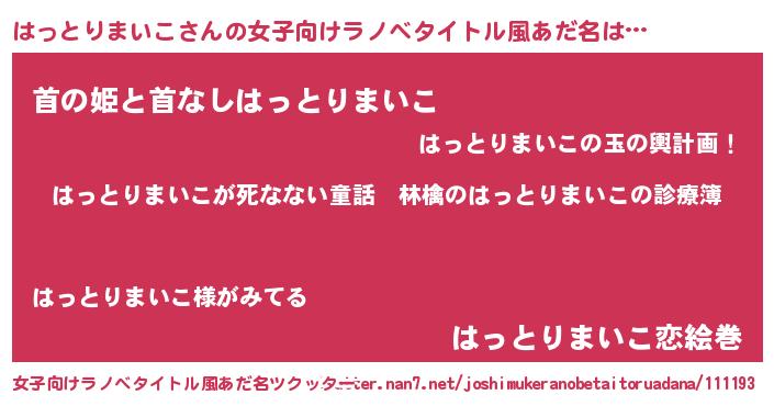 はっとりまいこさんの女子向けラノベタイトル風あだ名は… 『はっとりまいこが死なない童話 林檎のはっとりまいこの診療簿』『首の姫と首なしはっとりまいこ』『はっとりまいこ恋絵巻』 ツクッター #女子向けラノベタイトル風あだ名ツクッター http://tkutter.nan7.net/joshimukeranobetaitoruadana/111193/
