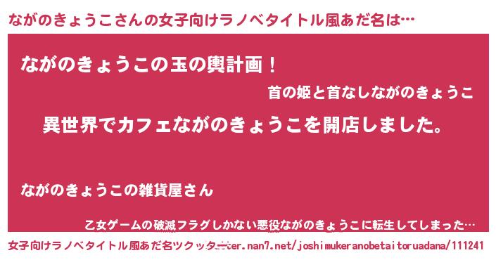 | 男性向けラノベタイトル風あだ名 | 『誰もが恐れるあのながのきょうこが、ぼくの専属メイドになるようです。』 |