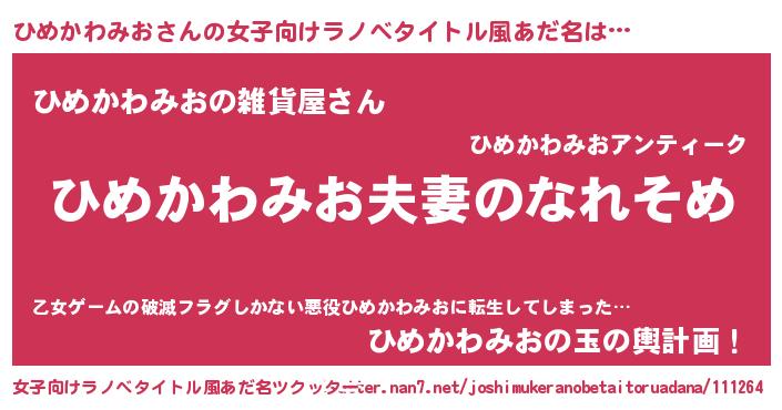 | 男性向けラノベタイトル風あだ名 | 『おまえをオタクにしてやるから、俺をひめかわみおにしてくれ! 』 |