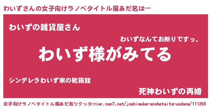 | 男性向けラノベタイトル風あだ名 | 『わいずの嫁は女の子じゃないと思った?』 |