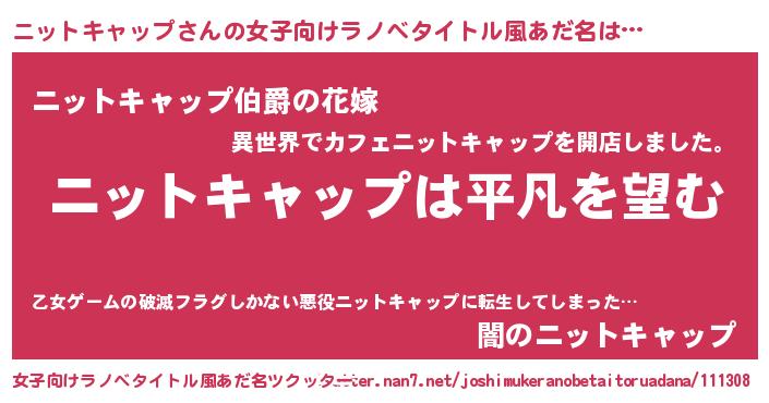 | 男性向けラノベタイトル風あだ名 | 『ダンジョンにニットキャップを求めるのは間違っているだろうか』 |