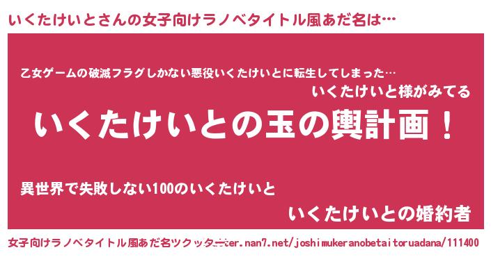 | 男性向けラノベタイトル風あだ名 | 『いくたけいと~年齢イコール彼女いない歴の魔法使い~』 |