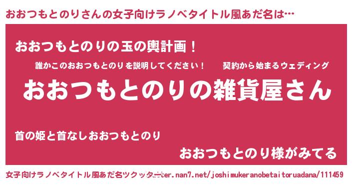 | 男性向けラノベタイトル風あだ名 | 『やはりおおつもとのりの青春ラブコメはまちがっている 』 |