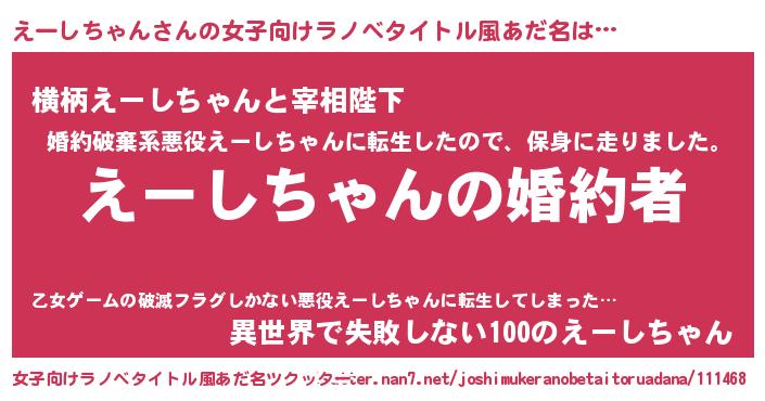 | 男性向けラノベタイトル風あだ名 | 『うちの娘の為ならば、俺はもしかしたらえーしちゃんも倒せるかもしれない。』 |
