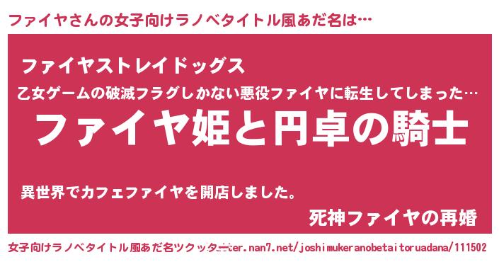 ファイヤさんの女子向けラノベタイトル風あだ名は… 『ファイヤ姫と円卓の騎士』『ファイヤストレイドッグス』『死神ファイヤの再婚』 ツクッター #女子向けラノベタイトル風あだ名ツクッター http://tkutter.nan7.net/joshimukeranobetaitoruadana/111502/
