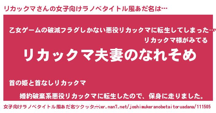 | 男性向けラノベタイトル風あだ名 | 『おまえをオタクにしてやるから、俺をリカックマにしてくれ! 』 |