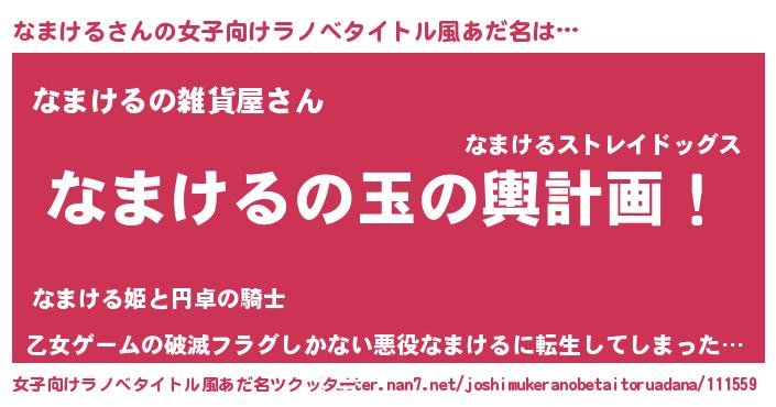 | 男性向けラノベタイトル風あだ名 | 『なまける~年齢イコール彼女いない歴の魔法使い~』 |