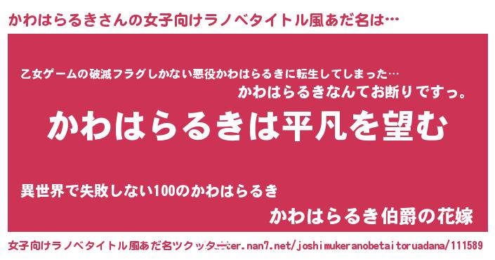| 男性向けラノベタイトル風あだ名 | 『ダンジョンにかわはらるきを求めるのは間違っているだろうか』 |