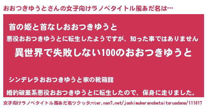 | 男性向けラノベタイトル風あだ名 | 『おおつきゆうとという概念が存在しない退屈な世界 』 |