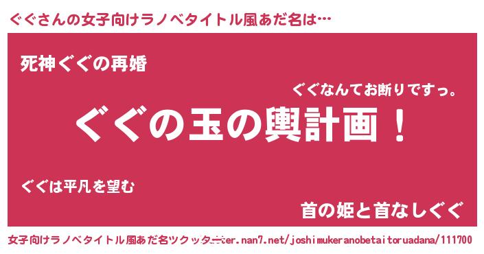 | 男性向けラノベタイトル風あだ名 | 『ぐぐ~年齢イコール彼女いない歴の魔法使い~』 |