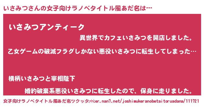 いさみつさんの女子向けラノベタイトル風あだ名は… 『乙女ゲームの破滅フラグしかない悪役いさみつに転生してしまった…』『いさみつアンティーク』『婚約破棄系悪役いさみつに転生したので、保身に走りました。』 ツクッター #女子向けラノベタイトル風あだ名ツクッター http://tkutter.nan7.net/joshimukeranobetaitoruadana/111721/