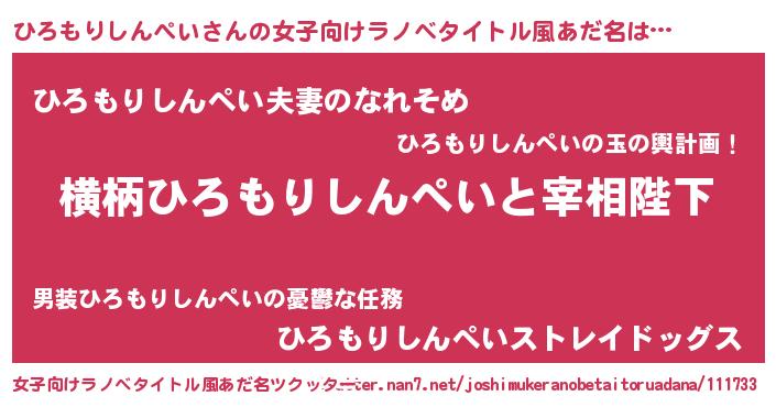 | 男性向けラノベタイトル風あだ名 | 『ひろもりしんぺいに滅ぼされるだけの簡単なお仕事です』 |