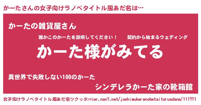 | 男性向けラノベタイトル風あだ名 | 『かーたの嫁は女の子じゃないと思った?』 |