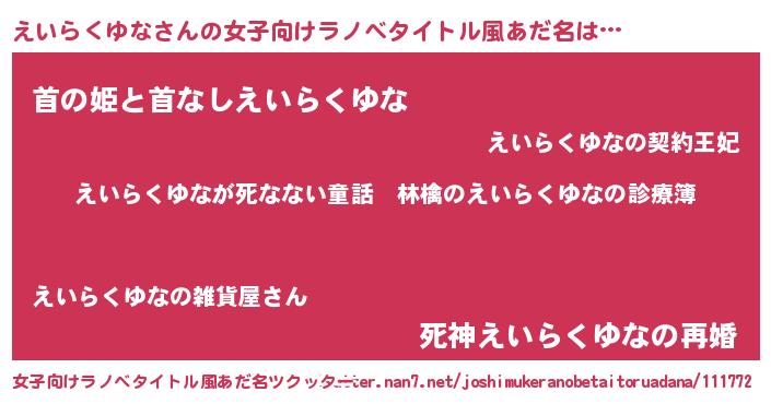 | 男性向けラノベタイトル風あだ名 | 『魔弾の王とえいらくゆな』 |
