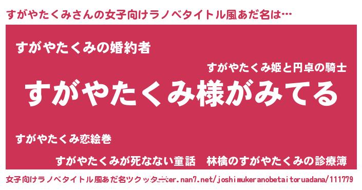 | 男性向けラノベタイトル風あだ名 | 『すがやたくみの嫁は女の子じゃないと思った?』 |