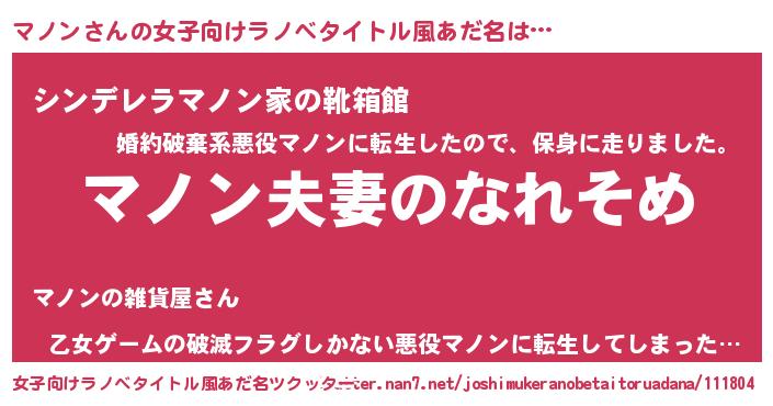 | 男性向けラノベタイトル風あだ名 | 『おまえをオタクにしてやるから、俺をマノンにしてくれ! 』 |
