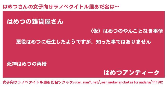 | 男性向けラノベタイトル風あだ名 | 『この素晴らしい世界にはめつを!』 |