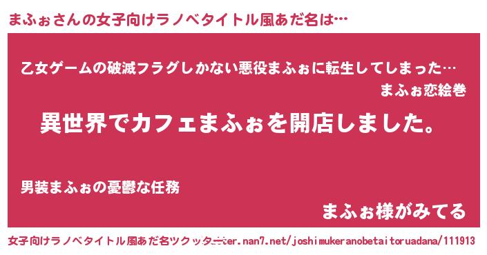 | 男性向けラノベタイトル風あだ名 | 『誰もが恐れるあのまふぉが、ぼくの専属メイドになるようです。』 |