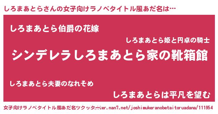 しろまあとらさんの女子向けラノベタイトル風あだ名は… 『シンデレラしろまあとら家の靴箱館』『しろまあとら伯爵の花嫁』『しろまあとらは平凡を望む』 ツクッター #女子向けラノベタイトル風あだ名ツクッター http://tkutter.nan7.net/joshimukeranobetaitoruadana/111954/