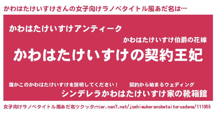 | 男性向けラノベタイトル風あだ名 | 『かわはたけいすけという概念が存在しない退屈な世界 』 |