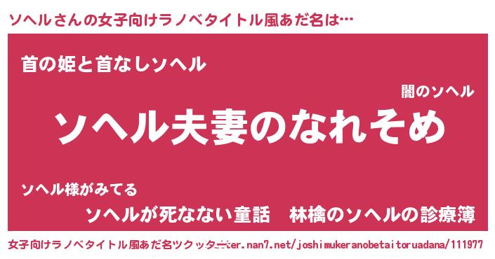 | 男性向けラノベタイトル風あだ名 | 『おまえをオタクにしてやるから、俺をソヘルにしてくれ! 』 |