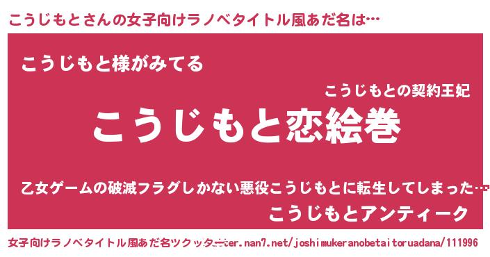 こうじもとさんの女子向けラノベタイトル風あだ名は… 『こうじもと恋絵巻』『こうじもと様がみてる』『こうじもとアンティーク』 ツクッター #女子向けラノベタイトル風あだ名ツクッター http://tkutter.nan7.net/joshimukeranobetaitoruadana/111996/