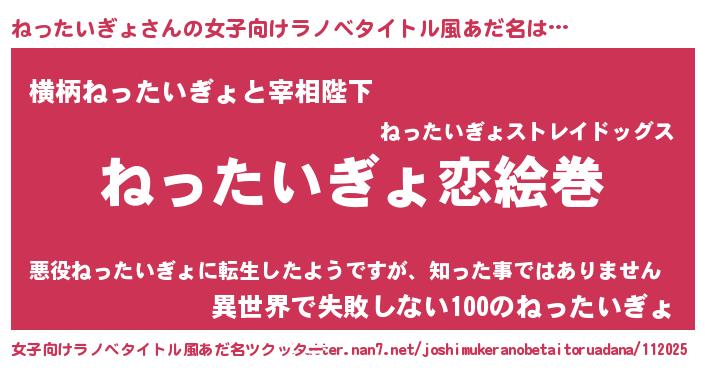 | 男性向けラノベタイトル風あだ名 | 『おまえをオタクにしてやるから、俺をねったいぎょにしてくれ! 』 |