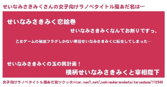 | 男性向けラノベタイトル風あだ名 | 『この素晴らしい世界にせいなみさきみくを!』 |