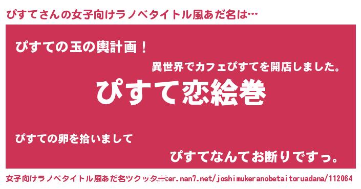 ぴすてさんの女子向けラノベタイトル風あだ名は… 『ぴすて恋絵巻』『ぴすての玉の輿計画!』『ぴすてなんてお断りですっ。』 ツクッター #女子向けラノベタイトル風あだ名ツクッター http://tkutter.nan7.net/joshimukeranobetaitoruadana/112064/