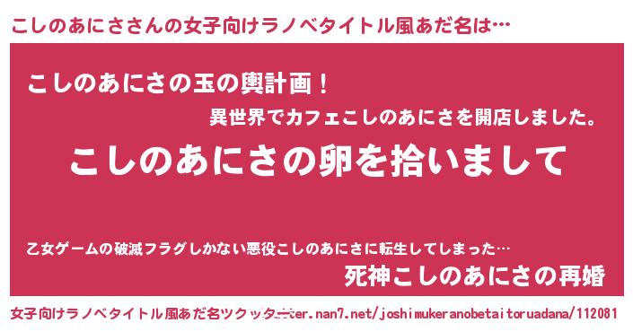| 男性向けラノベタイトル風あだ名 | 『こしのあにさの嫁は女の子じゃないと思った?』 |