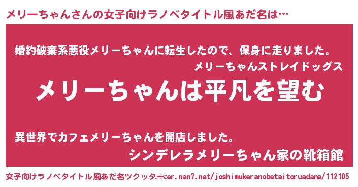 | 胡散臭い通販商品みたいなあだ名 | 『信頼と実績のペンダント…その名も「メリーちゃん」』 |