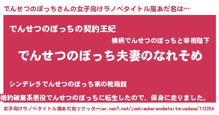 | 男性向けラノベタイトル風あだ名 | 『おまえをオタクにしてやるから、俺をでんせつのぼっちにしてくれ! 』 |