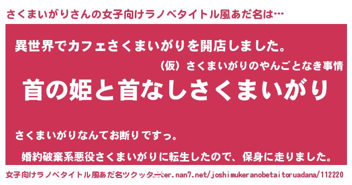 さくまいがりさんの女子向けラノベタイトル風あだ名は… 『首の姫と首なしさくまいがり』『異世界でカフェさくまいがりを開店しました。』『婚約破棄系悪役さくまいがりに転生したので、保身に走りました。』 ツクッター #女子向けラノベタイトル風あだ名ツクッター http://tkutter.nan7.net/joshimukeranobetaitoruadana/112220/
